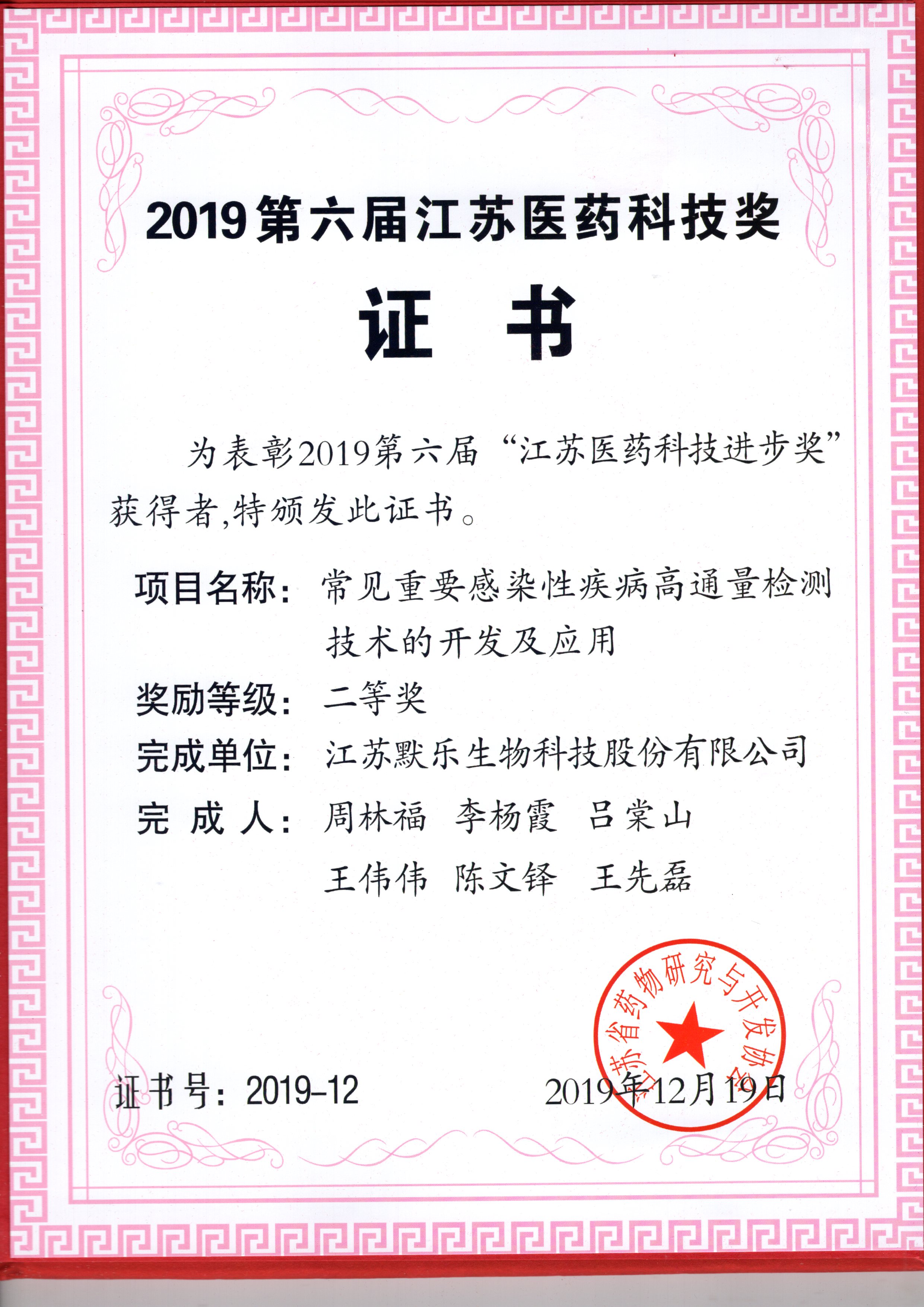 日前,我司申报的“常见重要感染性疾病高通量检测技术的开发与应用”项目,在第六届江苏省医药科技进步奖评比活动中,被授予“医药科技进步奖二等奖”。